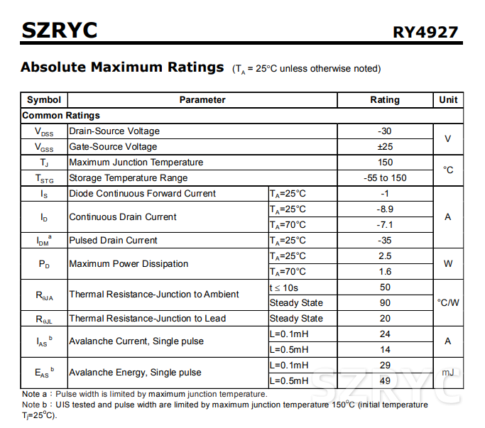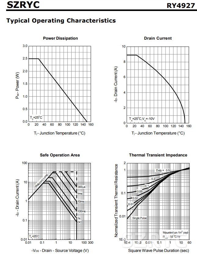 RY4927結合了先進的溝道MOSFET技術和低電阻封裝,以提供極低的Rds(on)。這種裝置是負載開關和電池保護應用的理想選擇。