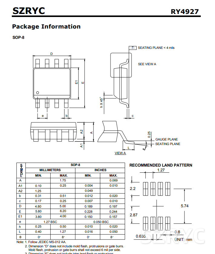 RY4927 雙P管,低內阻,SOP封裝MOS管,參數(shù):-30V/-30V, 15MR內阻, SOP-8封裝