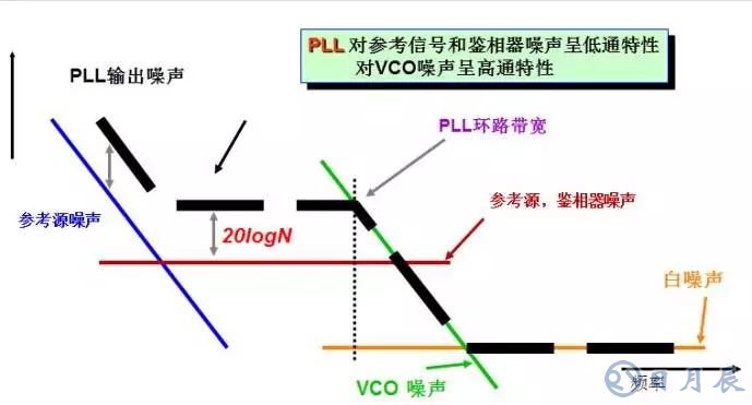 對(duì)參考源,PLL 為低通特性,帶寬為環(huán)路帶寬。PLL輸出相噪是參考信號(hào)相噪按N倍頻惡化。N越大,PLL輸出相噪指標(biāo)越差。在環(huán)路帶寬外,PLL輸出相噪由VCO 決定。