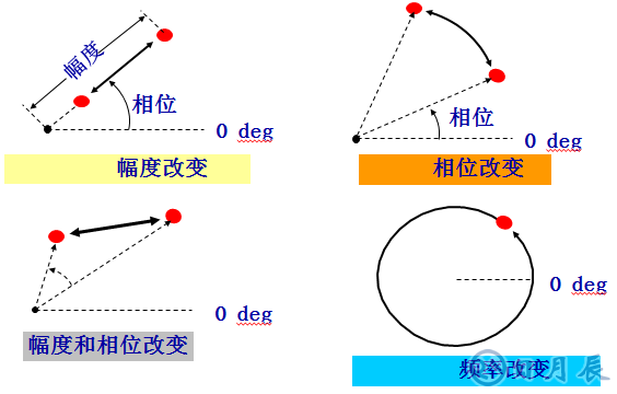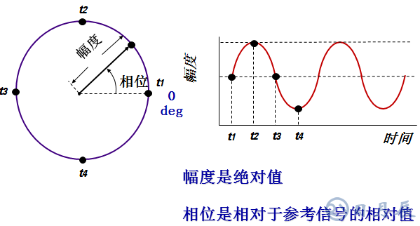 用矢量來描述一個(gè)正弦波是非常方便的。在極坐標(biāo)中,矢量表示正弦波的峰值電壓幅度對(duì)于相位改變量的關(guān)系。相位旋轉(zhuǎn)360度表示一個(gè)完整的頻率周期。請(qǐng)注意,相向符號(hào)提供了一種表示正弦波相位隨時(shí)間變化的便捷方法。圖中示波器表示了一種信號(hào)幅度隨時(shí)間變化的過程。向量不能直接提供任何頻率信息。事實(shí)上,我們測(cè)量向量相對(duì)于載波信號(hào)的參考相位。這樣作意味著,矢量僅在頻率不同時(shí)會(huì)發(fā)生旋轉(zhuǎn)。