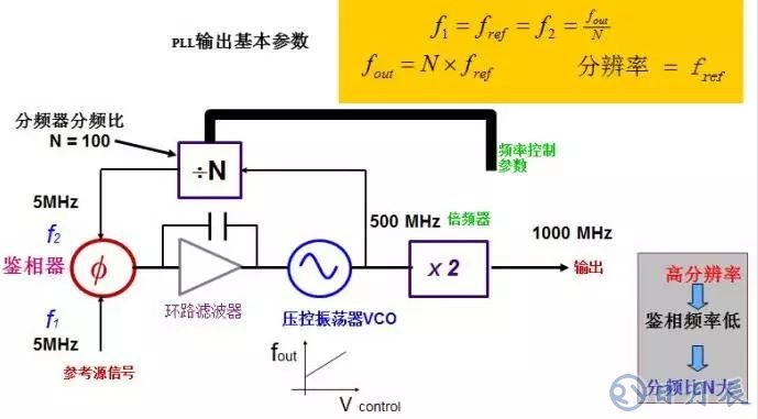 從頻率關(guān)系上分析,PLL相當(dāng)于一個(gè)倍頻器:PLL輸出信號(hào)頻率變化步進(jìn)為其鑒相器工作頻率。