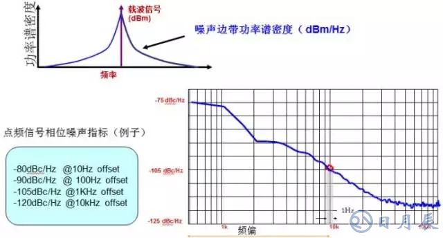 相位噪聲指標(biāo)主要在頻域上進(jìn)行描述,用一定頻偏(offset)下單邊帶(SSB)噪聲功率譜密度與載波功率比值來表示。工程上考察的頻偏范圍為:10Hz ~ 1MHz, 頻偏橫座標(biāo)用對(duì)數(shù)表示。