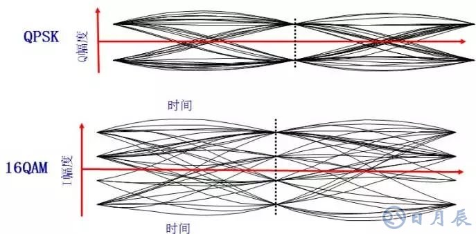眼圖以無限持續(xù)的方式反復(fù)顯示I和Q幅度對(duì)時(shí)間。I和Q轉(zhuǎn)換可單獨(dú)顯示,在確定符號(hào)的時(shí)刻形成“眼睛”。QPSK有4個(gè)不同I/Q狀態(tài),各在一個(gè)象限。I/Q各有兩個(gè)電平,對(duì)每個(gè)I和Q形成一個(gè)眼睛。下面一張圖是16QAM的例子,4電平圍成3只眼。重要的是理解眼圖的概念。好的信號(hào)具有“張大”的眼睛,交點(diǎn)對(duì)應(yīng)星座圖上符號(hào)點(diǎn)位置,調(diào)制質(zhì)量越高,交點(diǎn)越集中。