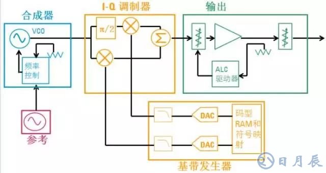IQ調(diào)制器:I和Q路信號(hào)由同一本振信號(hào)合成,但本振有90度相移,I/Q路互不干擾,最后得到一和路信號(hào)。