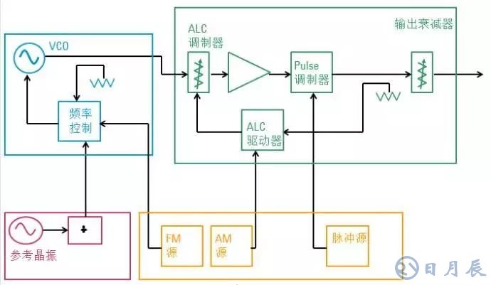信號(hào)源利用ALC(自動(dòng)電平控制)技術(shù)來保證輸出信號(hào)的幅度。大范圍幅度調(diào)整由衰減器完成。
