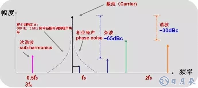 正弦波或連續(xù)波信號(hào)質(zhì)量好壞的評(píng)估主要在頻域上進(jìn)行,頻域上的雜散包含連續(xù)和離散成份,它們都對(duì)應(yīng)時(shí)域上的失真。連續(xù)的噪聲邊帶稱為相位噪聲,離散的雜散根據(jù)其與基波的頻率關(guān)系分為諧波和雜波。