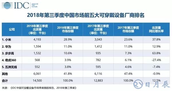 12月26日消息,根據(jù)IDC本周發(fā)布的《中國可穿戴設(shè)備市場季度跟蹤報告》,2018年第三季度中國可穿戴設(shè)備市場出貨量為1450萬臺,同比增長12.5%。