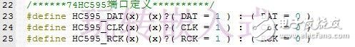 與單片機相連接的三個腳分別為:HC_DAT,HC_RCK,HC_CLK。兩片595采用級聯(lián)方式,即U2的第9腳接到U3的第14引腳。
