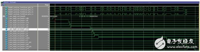 基于車電總線接口單元模塊對(duì)FlexRay接口狀態(tài)機(jī)制進(jìn)行了驗(yàn)證,利用ModelSim對(duì)邏輯設(shè)計(jì)進(jìn)行仿真,其波形圖如圖14所示。