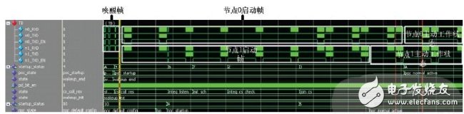 從仿真波形中可以清楚地看出FlexRay狀態(tài)機(jī)制的變化過程。當(dāng)節(jié)點(diǎn)的收發(fā)器接收到喚醒特征符后,對(duì)主機(jī)處理器和通信控制器進(jìn)行上電,喚醒并激活通信控制器、總線驅(qū)動(dòng)器和總線監(jiān)控器。節(jié)點(diǎn)0被喚醒后,將返回喚醒完成信號(hào),并處于等待啟動(dòng)狀態(tài)。接著節(jié)點(diǎn)1收到喚醒信號(hào),返回喚醒完成信號(hào),節(jié)點(diǎn)1進(jìn)入啟動(dòng)狀態(tài),節(jié)點(diǎn)0也進(jìn)入啟動(dòng)狀態(tài),最終都進(jìn)入主動(dòng)工作狀態(tài),開始狀態(tài)機(jī)循環(huán),顯示FlexRay總線接口工作正常。