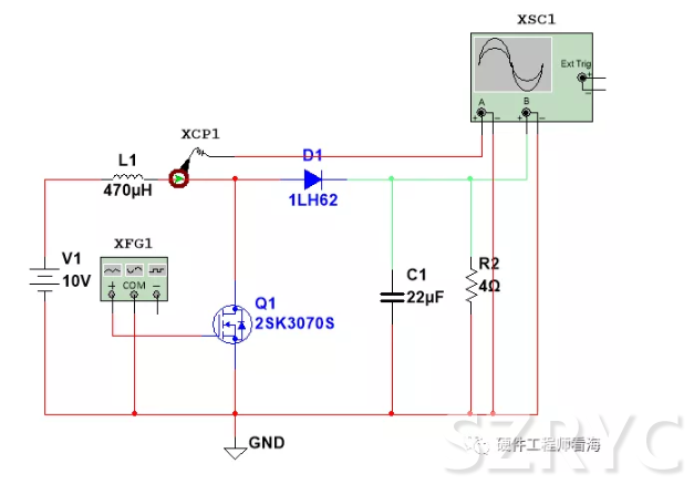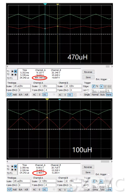 我們對(duì)上圖中的boost進(jìn)行仿真,分別對(duì)比470uH和100uH時(shí)的紋波,示波器中綠色的是輸出電壓,紅色的是電感電流。