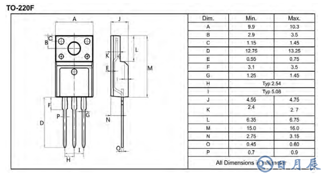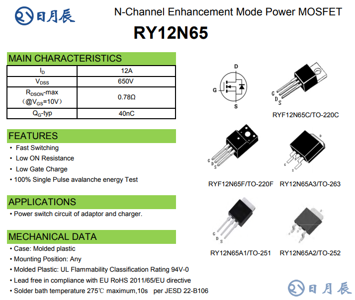 首選從這張圖中我們可以看出,日月辰RYF12N65F是RY12N65當中的一款封裝,產(chǎn)品總的有5種封裝。而TO-220F封裝是最常用的其中一種。