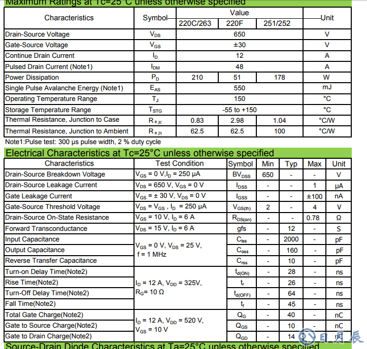 RYF12N65F 是日月辰公司推出的,代替士蘭微SVF12N65F的產(chǎn)品,內(nèi)阻更小,發(fā)熱更小,散熱更好。在100°時,通過的電流更大。我們現(xiàn)在來具體查看下這款高壓MOS的參數(shù)。